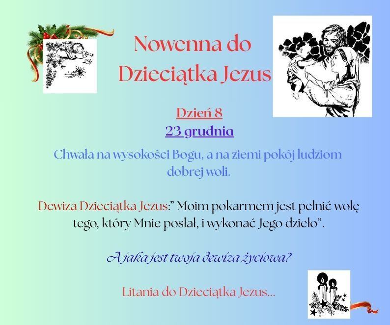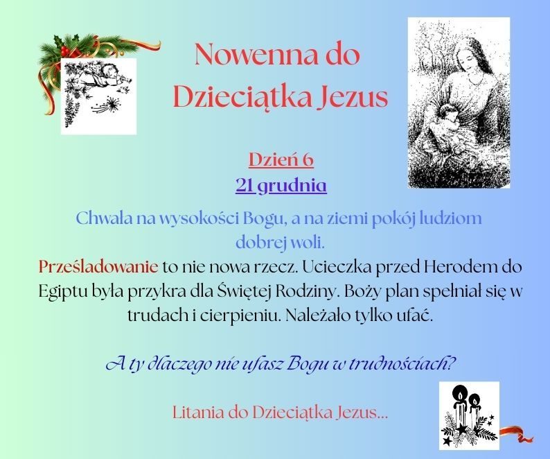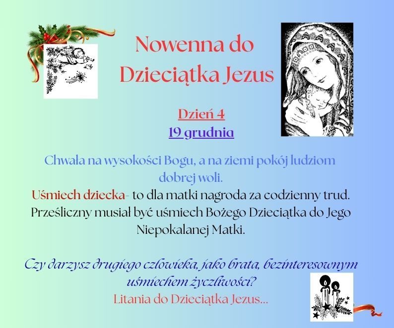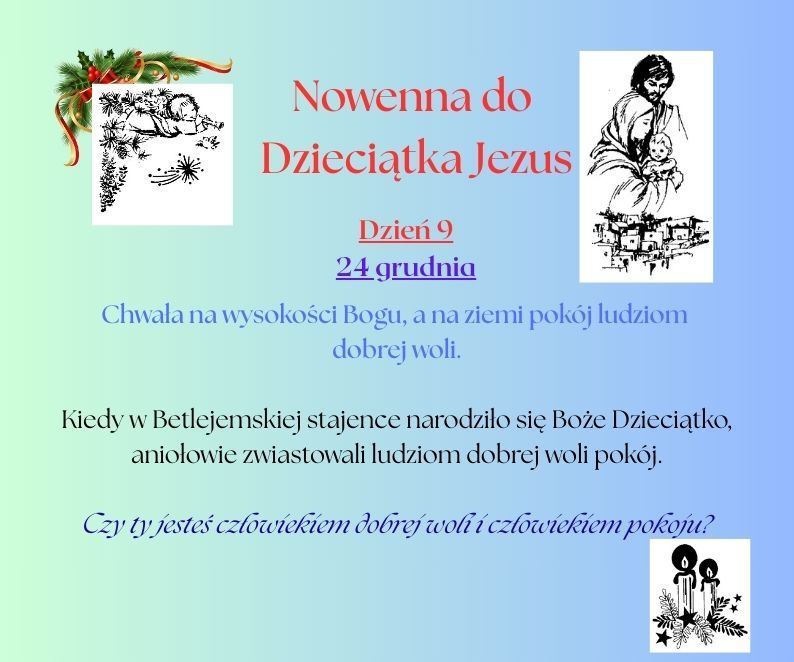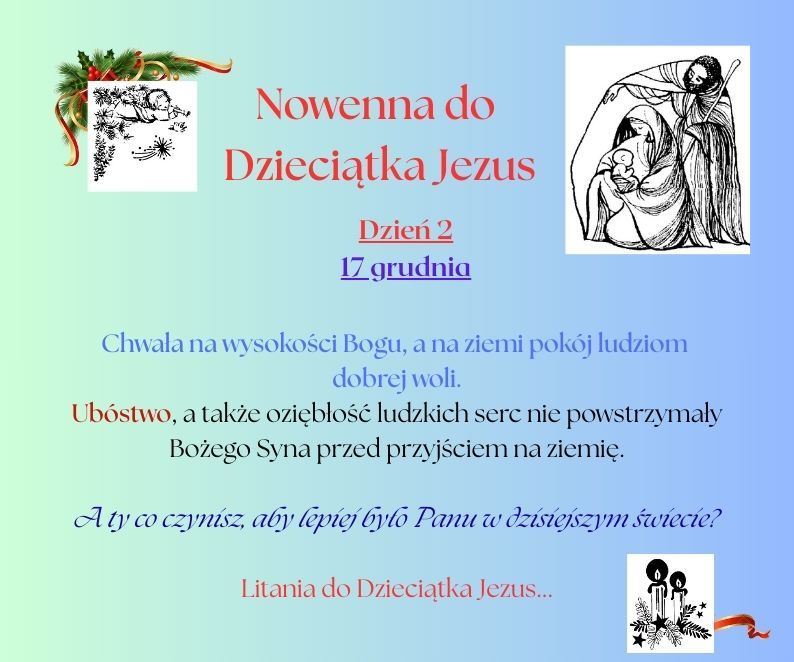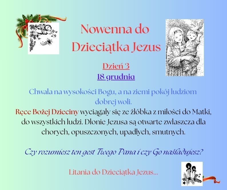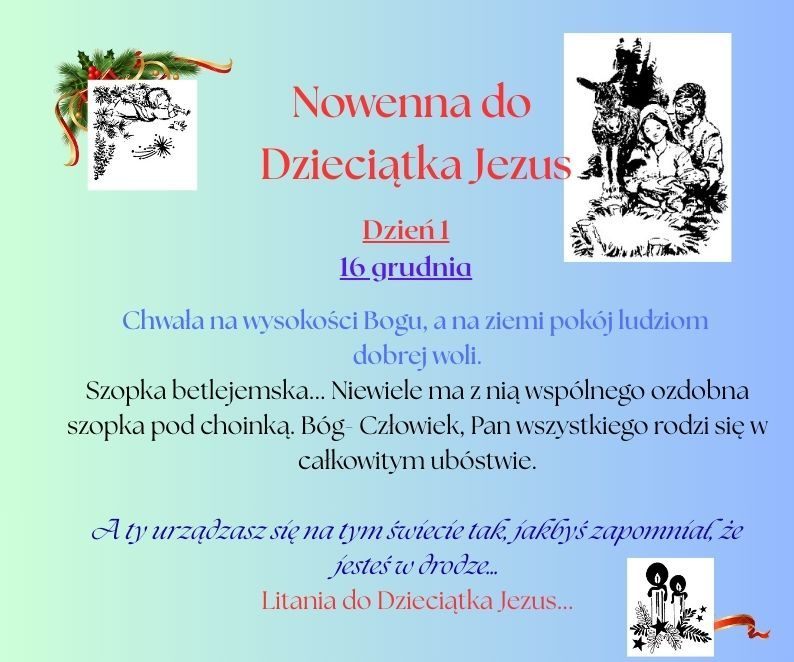 Od 16 grudnia rozpoczyna się czas bezpośredniego przygotowania do Świąt Bożego Narodzenia. Poprzez modlitwę Nowenny do Dzieciątka Jezus ustawiamy nasze serca w kierunku żłóbka.